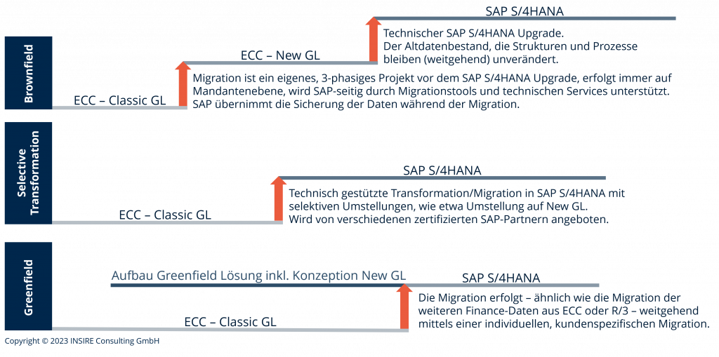 Die neue Hauptbuchhaltung existiert in SAP bereits seit dem Release ECC 6.0. Die Nutzung jedoch war bislang optional. Da der Umstieg von der klassischen auf die neue Hauptbuchhaltung eine Migration erfordert, entschlossen sich viele R/3- und ECC-Kunden, ihre Lösung auf Basis des Classic GL beizubehalten (beispielsweise mit etablierten Konten- oder Buchungskreislösungen für die parallele Buchhaltung). In SAP S/4HANA jedoch ist die Nutzung von New GL nun zwingend. Gleichzeitig verbinden sich mit der Konfiguration des New GL sehr grundlegende konzeptionelle Fragen für den Aufbau der zukünftigen Finanz- und Controlling-Strukturen und der Prozesse in SAP S/4HANA. Daher ist die Konzeption der neuen Hauptbuchhaltung ein wichtiger Punkt in einer SAP S/4HANA Transformation. Die Einführung und die Migration auf die neue Hauptbuchhaltung muss in der SAP S/4HANA-Transformations-Planung berücksichtigt werden. Die drei bekannten SAP S/4HANA Transformationsansätze, Brown, Blue und Green Field, unterscheiden sich diesbezüglich.