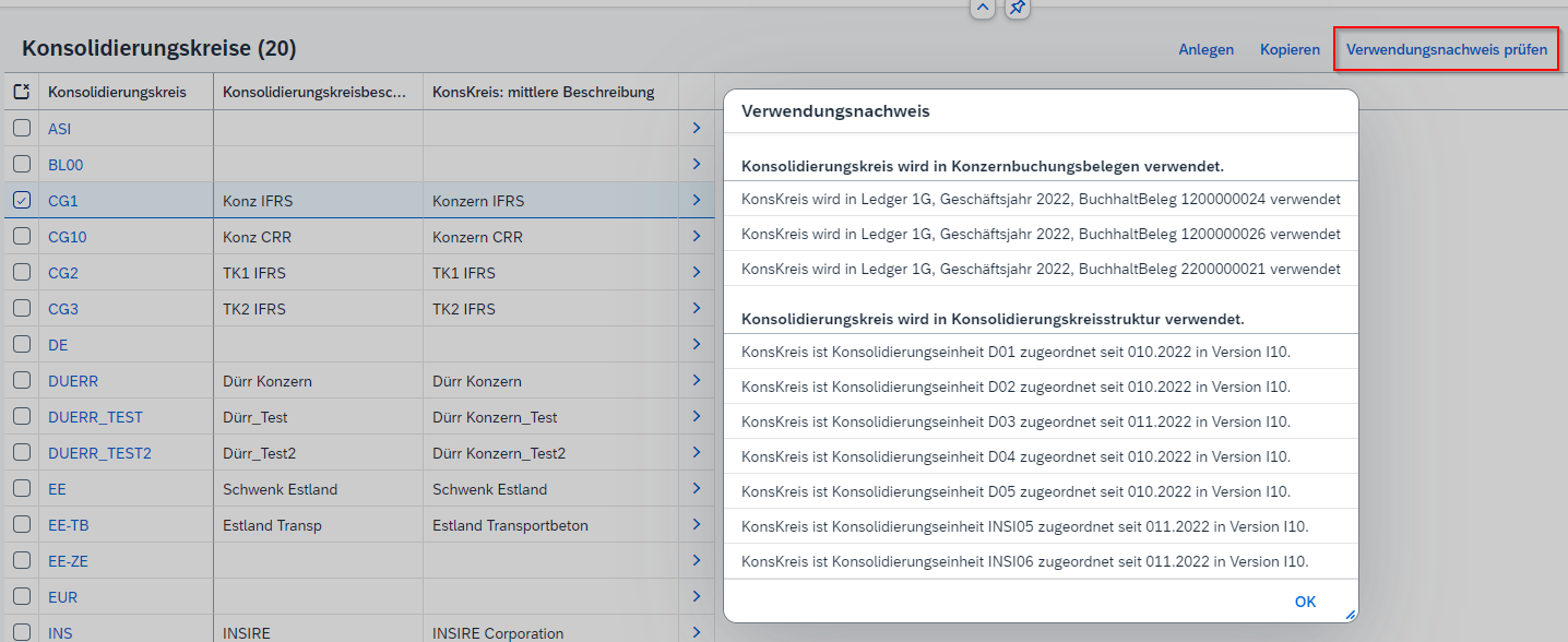 Um sicherzustellen, dass keine Konsolidierungsgruppen gelöscht werden, die sich in aktiver Verwendung befinden, wurde eine Verwendungsprüfung implementiert. Diese Funktion hilft, Fehler zu vermeiden und die Datenintegrität zu gewährleisten, indem sie verhindert, dass wichtige Stammdaten ungewollt entfernt werden.