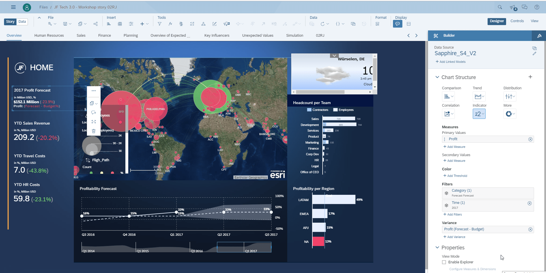 Eine weitere Komponente der SAP Analytics Cloud ist der Digital Boardroom – ein Cockpit für die systemintegrierte Aufbereitung von Abschlusszahlen, das für Präsentationszwecke eingesetzt wird. Mit der Nutzung des Digital Boardroom entfallen aufwendige Aufbereitungen von Präsentationen. Insbesondere, wenn das Zahlenmaterial eine erneute Aktualisierung erfährt, sind häufig sehr kurzfristige Korrekturläufe in den Unterlagen notwendig, was den Mitarbeiter nicht selten Schweißperlen auf die Stirn treibt. Das Tool ist somit ein weiterer Baustein hin zum papierlosen Prozess. Die eigentliche Präsentation wird innerhalb des SAP Digitial Boardroom erstellt, erforderliche Daten in die Präsentation integriert und in Echtzeit visualisiert. Es ist jedoch auch möglich die Realtime-Funktion abzuklemmen, um bspw. für einen bestimmten Präsentationstermin ein zuvor vorbereitetes und abgestimmtes Ergebnis zu zeigen, welches ggf. parallel auch in anderen Medien präsentiert wird. Wie genau die Ausgabe der Zahlen erfolgt, kann selbstverständlich unternehmensindividuell definiert werden. Mit der Definition einer eigenen „Story“ können verschiedenen Verantwortlichen unterschiedliche Teile der Präsentation zugewiesen werden, um somit einen professionellen und strukturierten Ablauf bspw. von Gremiumssitzungen sicherzustellen und digital zu unterstützen.