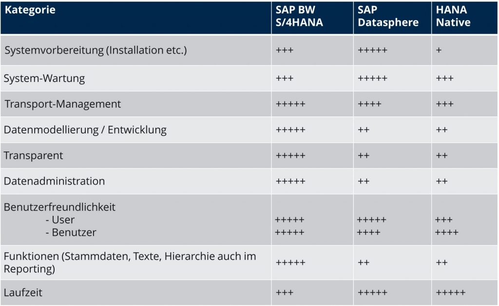 Insgesamt hängt die Wahl zwischen SAP BW/4HANA, SAP Datasphere und HANA Native von den individuellen Anforderungen und Ressourcen Ihres Unternehmens ab. BW/4HANA bietet umfangreiche Funktionen für umfassendes Datenmanagement und -analysen, Datasphere erleichtert die Datenintegration, und HANA Native bietet maximale Flexibilität und Leistung, erfordert jedoch spezialisiertes technisches Know-how. Eine sorgfältige Analyse Ihrer Geschäftsanforderungen ist entscheidend, um die richtige Entscheidung zu treffen, bei der wir Ihnen sehr gern behilflich sind!