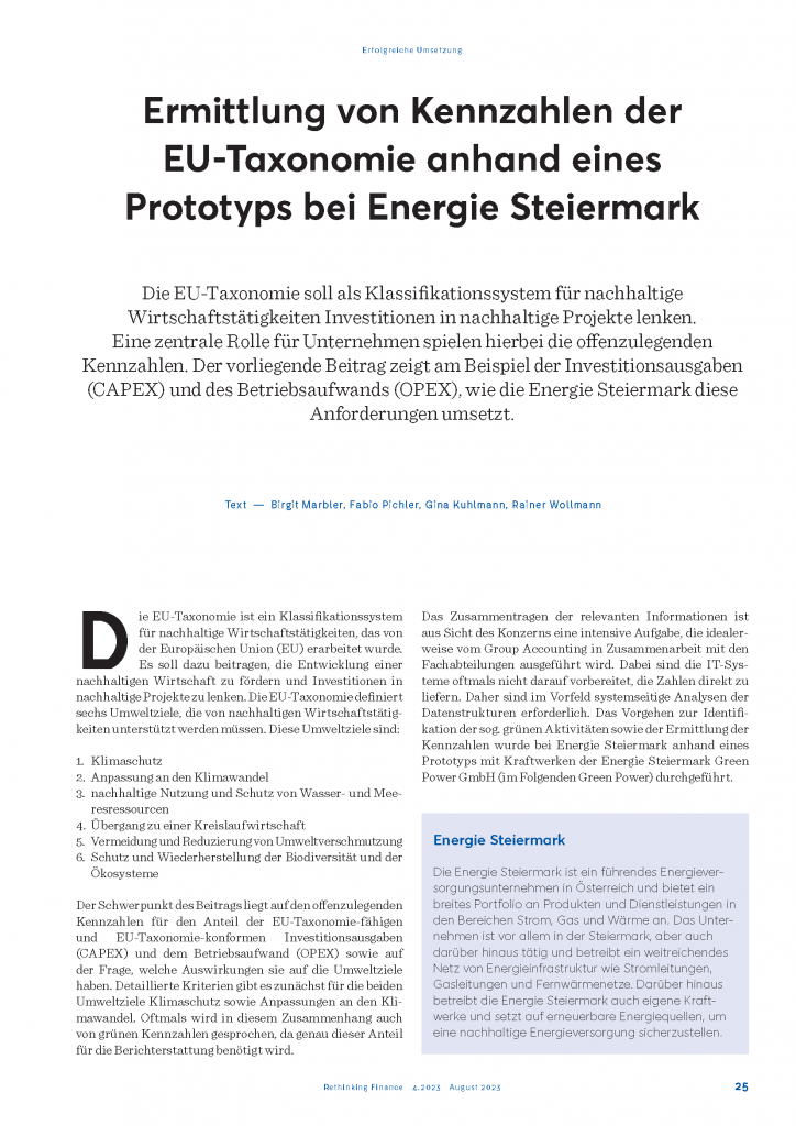 Entdecken Sie in unserem fachlich fundierten Beitrag, wie das wegweisende Pilotprojekt in enger Zusammenarbeit mit der Energie Steiermark AG eine innovative Lösung für die Identifizierung des wertmäßigen Anteils nachhaltiger Aktivitäten in den finanziellen Kennzahlen bereithält. Unsere Experten zeigen auf, wie erfolgreich diese Lösung die Herausforderungen bewältigt, den Prozess vereinfacht und gleichzeitig den Weg für eine präzise Bewertung der Nachhaltigkeitsleistung ebnet – alles unter Einbeziehung einer innovativen EU-Taxonomie-Plattform. Lassen Sie sich von den erzielten Ergebnissen inspirieren und erfahren Sie, wie die Zukunft der finanziellen Nachhaltigkeitsbewertung gestaltet wird!