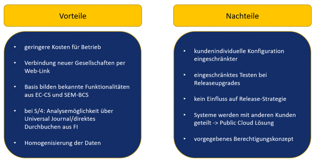 Die Cloud-Lösung bringt derzeit jedoch auch Einschränkungen mit sich, wenn es um kundenindividuelle Konfiguration geht. Es wird demnach eine Reihe von Systemeinstellungen geben, die von SAP standardisiert ausgeliefert werden und somit von allen Kunden zu nutzen sind. Hierbei handelt es sich bspw. um den Aufbau des Datenmodells oder um die Abarbeitung der einzelnen Schritte des Konsolidierungsprozesses. Zudem gibt sich der Kunde bei Themen wie Releasestrategie oder Berechtigungen in die Hände des Herstellers. Insbesondere bei der Releasestrategie und dem dazugehörigen Testing ist zu prüfen, ob sich die vorgegebenen zeitlichen Rahmenbedingungen des Herstellers mit dem Berichtskalender der Konzerne vereinbaren lassen.