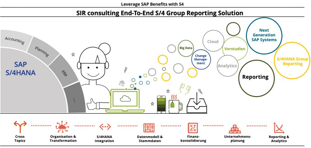 Die Abschlussprozesse werden unter Nutzung von S/4 zentralisiert. Datenredundanzen und komplexe Datentransferprozesse können umgangen, gleichzeitig kann die Transparenz und Analysemöglichkeit von Abschlusszahlen deutlich erhöht werden. Es besteht zudem die Option ein konsolidiertes Managementreporting deutlich detaillierter aufzusetzen, wenn es aus Gesichtspunkten der Konzernsteuerung Sinn macht. Von zentraler Bedeutung im Rahmen von Umsetzungsprojekten ist die Ausweitung des Blickwinkels und der Einbezug der Berichtsprozesse aus Sicht des Konzern- und Managementreporting. Es gilt ein Business Process Template zu entwickeln, welches die Buchungsprozesse von operativen Transaktionen bis zum Ausweis in einem konsolidierten Berichtswesen beschreibt. Ziel ist es, das Zusammenspiel zwischen den Anforderungen an die operativen Geschäftsprozesse und denen des Konzernberichtswesens in Einklang zu bringen.