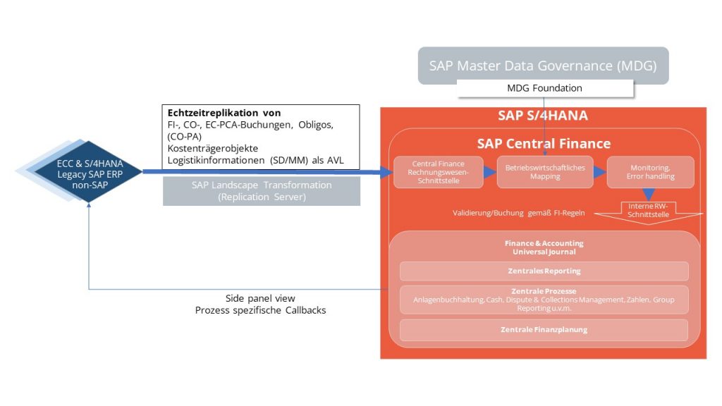 SAP Central Finance, kurz SAP CFIN, ist eine SAP S/4HANA Lösung, die es erlaubt, Finanzdaten aus heterogenen transaktionellen SAP- wie Non-SAP-Systemen in Echtzeit zu replizieren und damit moderne, zentrale Finanzprozesse zu realisieren. Damit bietet SAP Central Finance die Möglichkeit, die SAP S/4HANA Transformation hinsichtlich Finanzprozesse zu beschleunigen. Zudem ermöglicht es eine Zentralisierung der Finanzprozesse auch innerhalb einer permanent oder langfristig komplexen Systemlandschaft.