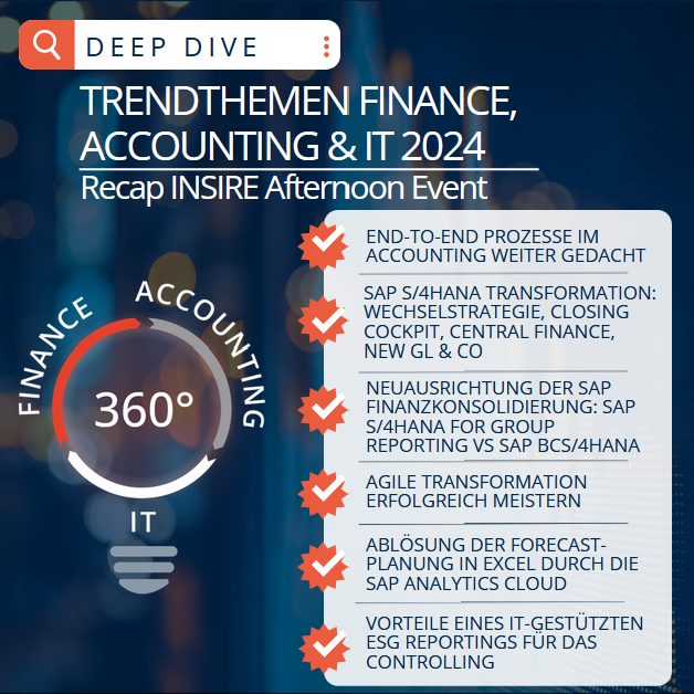 Verpassen Sie nicht die Trends 2024 zum Thema Finance, Accounting & IT! Sie konnten nicht am INSIRE Afternoon Event teilnehmen und möchten dennoch über die neusten Trendthemen informiert sein? Kein Problem! Unser Recap gibt Ihnen einen Überblick über die Entwicklungen in der Branche.